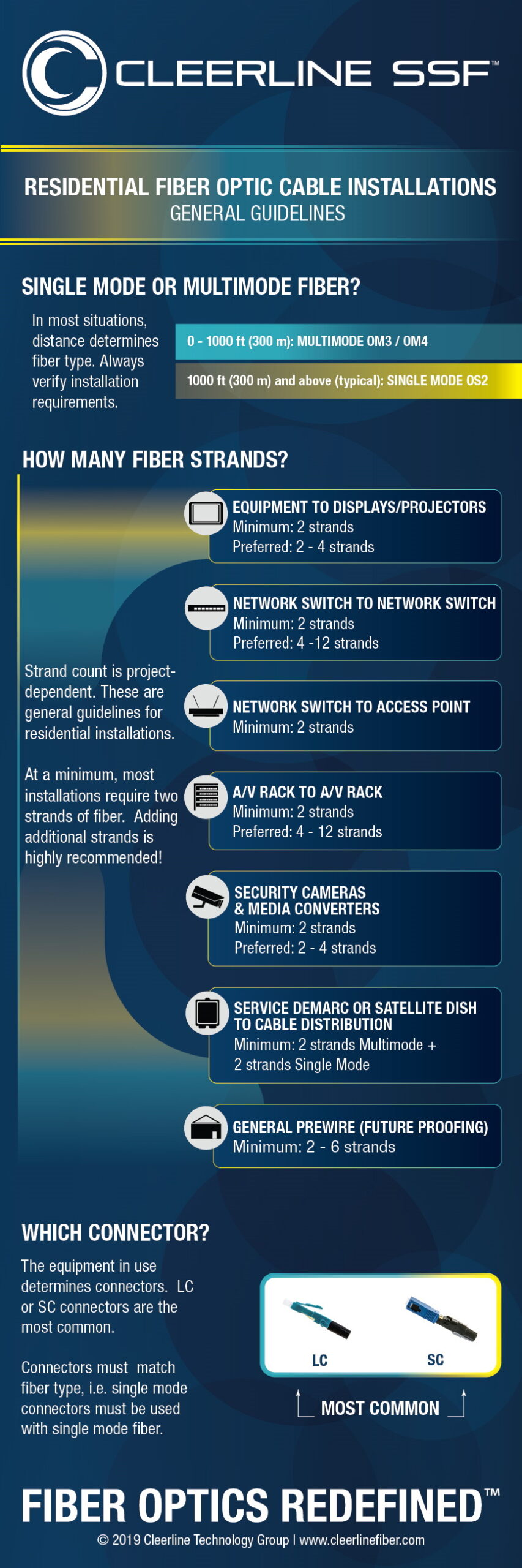 The number of fiber strands is ultimately determined by installation requirements, including length of cables installed, etc., which ultimately can determine cable type required. We’ve included some recommendations below based on common installations. You can also view this information or download this chart . Please note that it is always best to confirm based on the equipment to be installed.